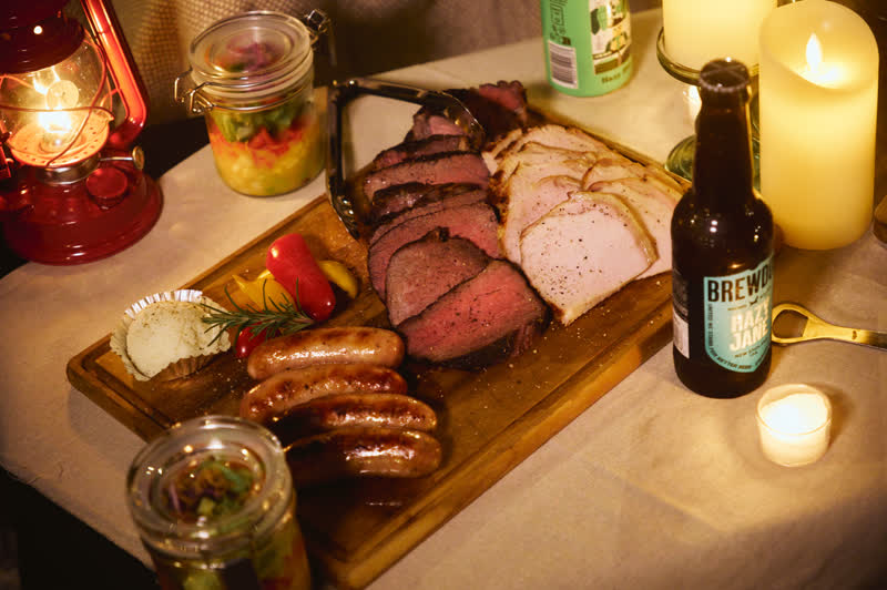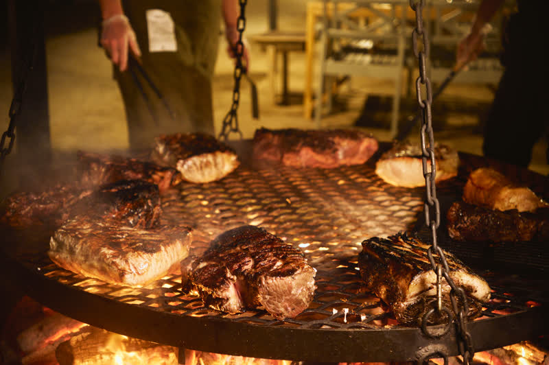 ETOWA KISARAZUの夕食は豪快なBBQです。目の前で、塊のお肉をシェフが焼き、ご提供します。大迫力の炎と、季節ごとに変わるメニューをお楽しみください。愛犬用のお席もご用意しております。