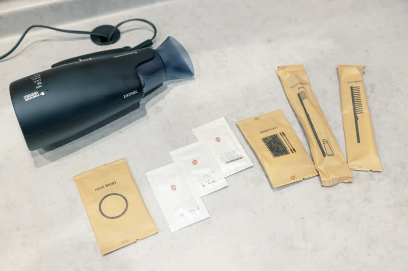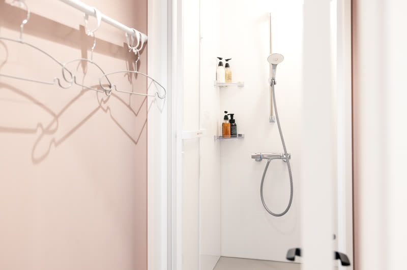 シャワールームでは、ハンドタオル、バスマット、シャンプー、コンディショナー、ボディソープ、クレンジングオイル、綿棒・コットン、歯ブラシ、くし、ドライヤー、ヘアアイロンが常備されています。