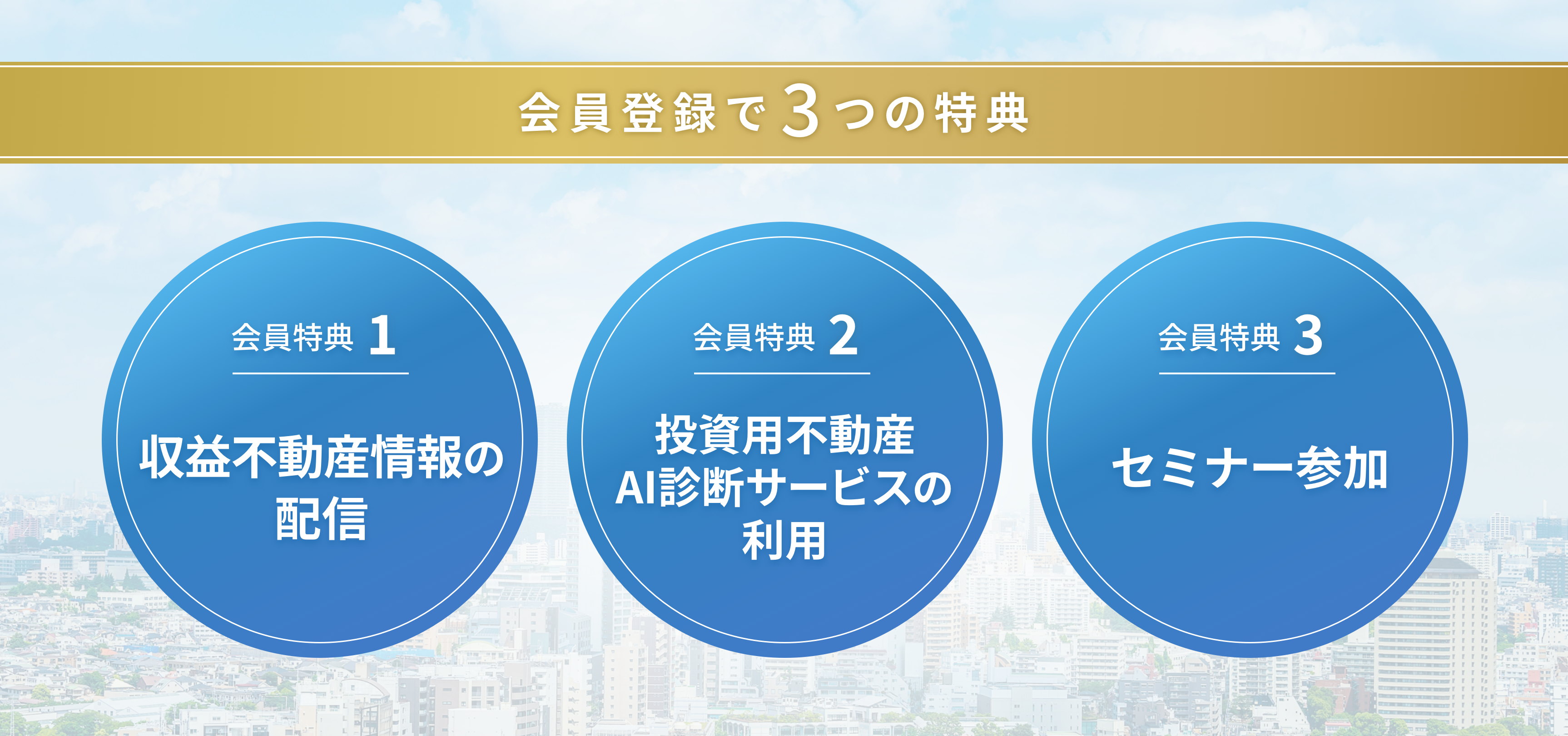 会員にご登録いただくと、物件情報や各種お役立ち情報のほか、会員限定のセミナーなどをご案内いたします。またご希望の方は別途お申込みをいただくことで、投資用不動産AI診断サービスをご利用いただけます。