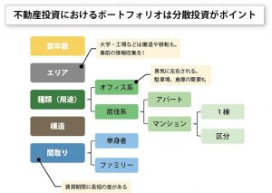 不動産におけるポートフォリオ(分散投資)の組み方は、①築年数➁エリア③種類(用途)―が柱で、この要素によって物件を選択します。これに木造やRC造などの「構造」や単身者か家族向け(ファミリー)かの「間取り」が続きます。