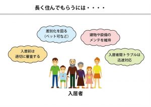 トラブル未然防止の観点から、入居予定者の事前審査を厳しくすることも検討してます。早期に入居してほしいため事前のチェックが甘くなり、その結果トラブルが生じて他の入居者が退室すれば元も子もありません。ただプライバシーや人権の問題などもありますが、物件を選んだ理由や、引っ越した理由を聞くなどして判断します。