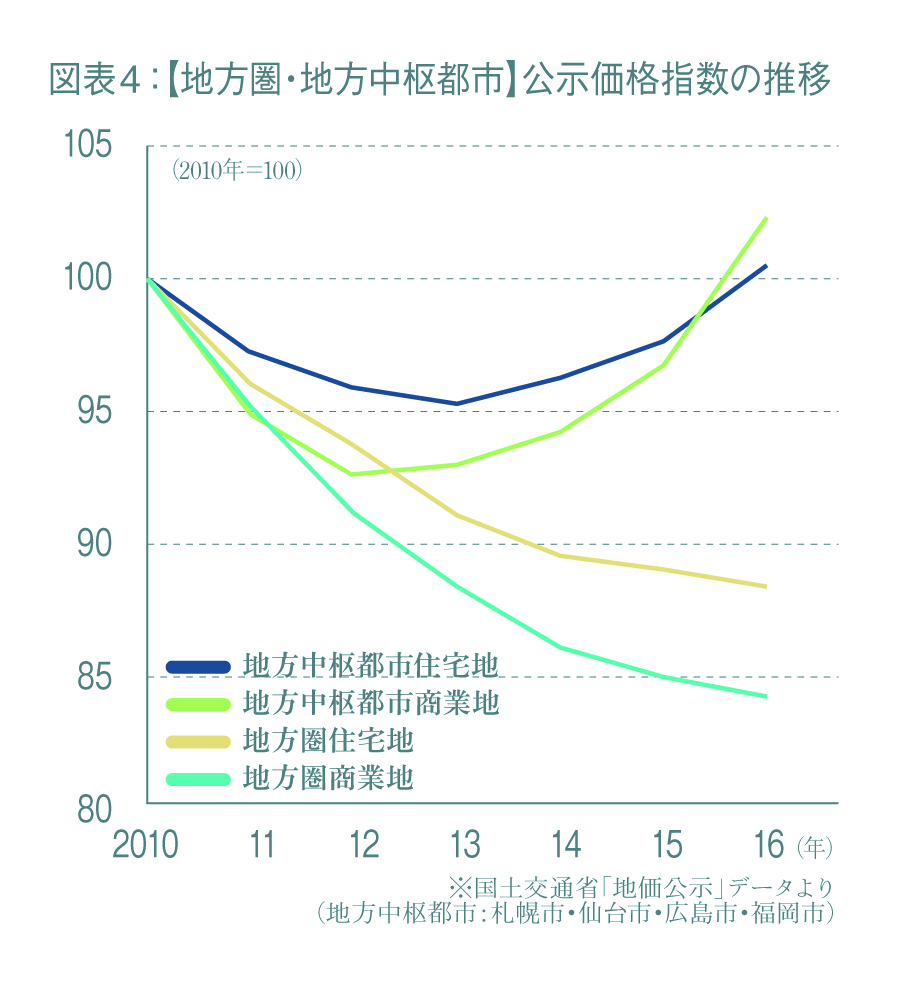 今後、この状況が一段と顕著になっていくことは否定できない。図表4を見ると、同じ地方圏でも地方中枢都市とその他では、トレンドが全く異なっている。この背景には、人口の増減、地域の経済力、資金流入の有無、交通機関の充実度などの差異がある。不動産の価値は、これらの条件によって雲泥の差がつく時代になってきている。