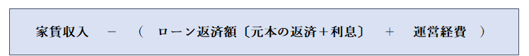 たとえば、1か月に家賃収入120万円で、元本と利息を足したローン返済額が60万円、運営経費を50万円とすれば、120万円-60万円-50万円=10万円(税引き前利益)となります。(あくまで、入金と支払が同じタイミングであることを想定しています)