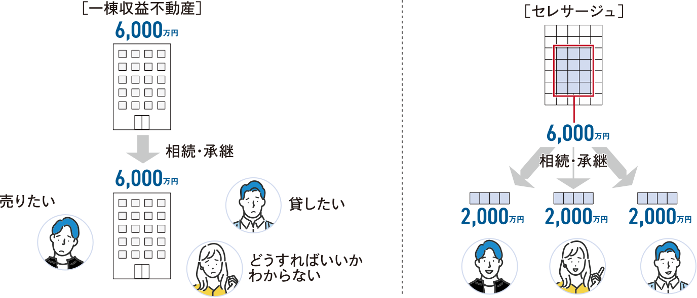 相続発生時、「セレサージュ」シリーズは1口ごとの分割が可能です。分割後、承継人それぞれの意向に合わせて継続保有や売却など選択が可能です。