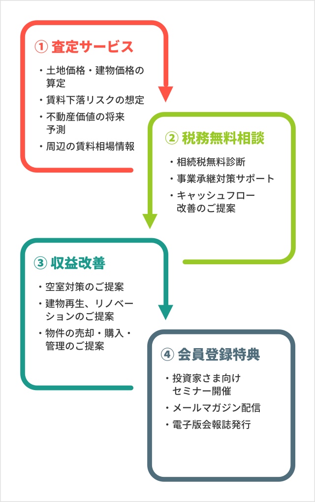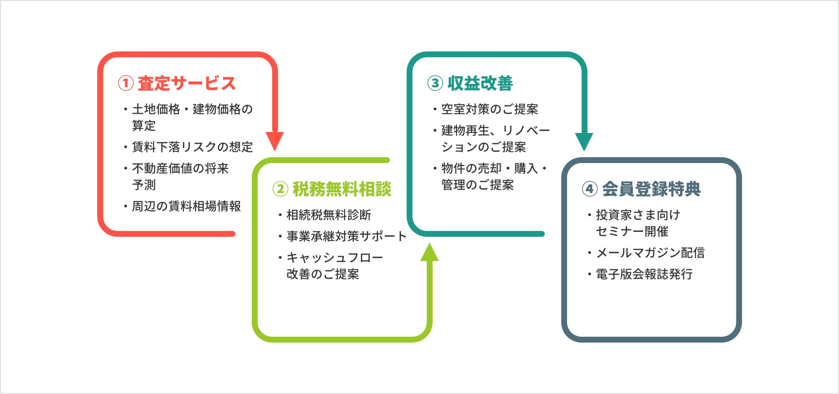 その他、不動産総合デベロッパーならではのノウハウを活用し、ご所有不動産の空室対策やバリューアップ、資産の組換えまで幅広くご提案いたします。お客さまの大切な資産の有効活用のため、サポートいたします。
