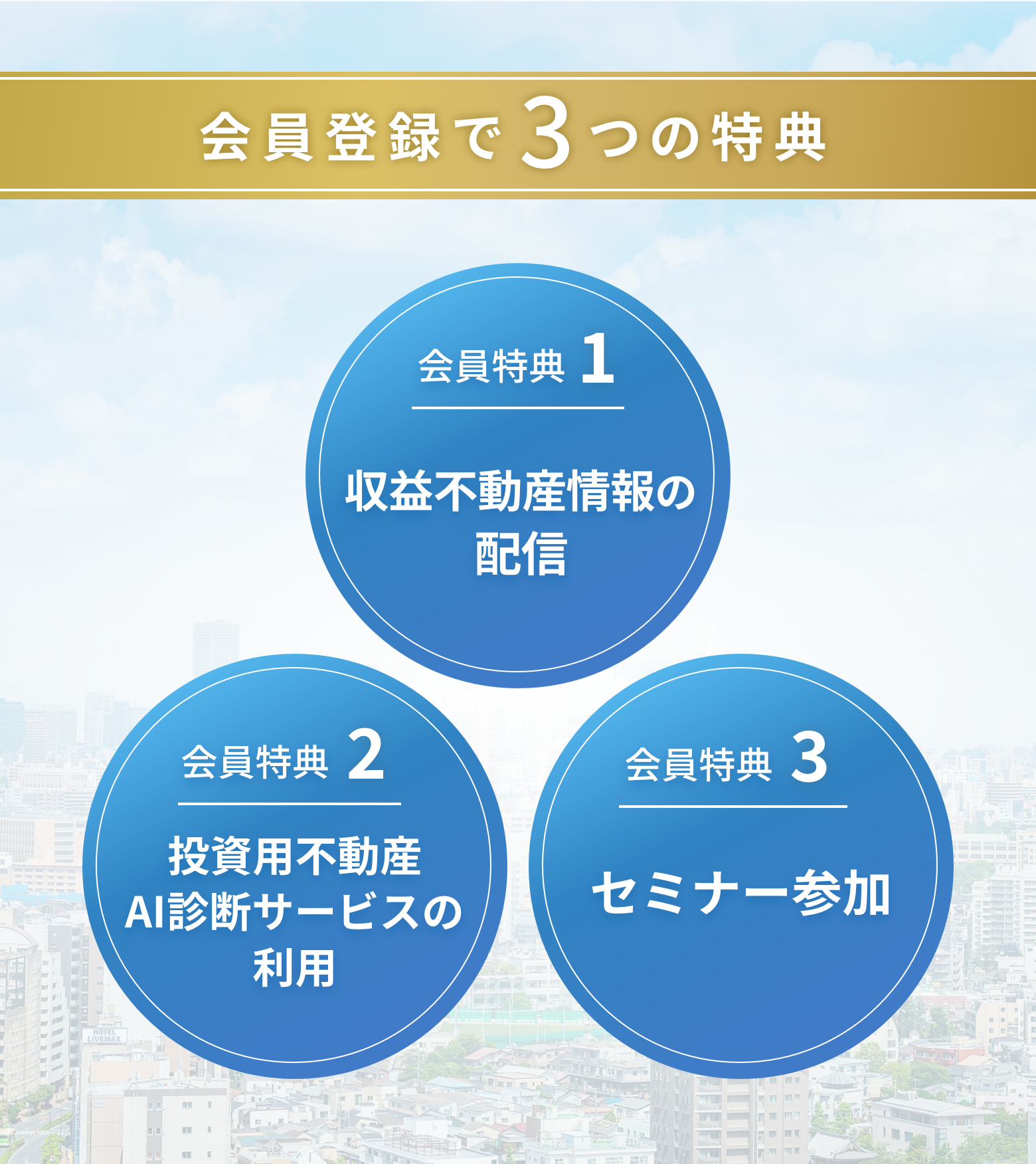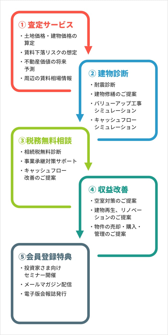 会員にご登録いただくと、物件情報や各種お役立ち情報のほか、会員限定のセミナーなどをご案内いたします。またご希望の方は別途お申込みをいただくことで、投資用不動産AI診断サービスをご利用いただけるほか、ホームページに掲載していない収益不動産情報を定期的にお届けいたします。