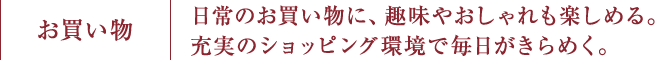 スーパーマーケットやインテリア、フィットネスクラブやレストランなど、多彩な施設が揃っています。周りには緑が多く配されており、買い物やフィットネスの合間に、ほっと一息つける空間が魅力。