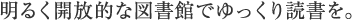平日は朝9時から夜8時まで開館している便利さがうれしい限り。予約、情報検索などの相談にも親切に対応してくれます。大活字本の品揃えも充実しています。