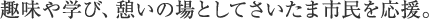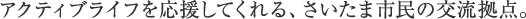 南区の「サウス」、仲間たちの「ピア」を合わせて命名されたサウスピア。2013年にオープンしたさいたま市南区の情報発信基地であり、市民の交流施設としても親しまれています。サウスピアの中には南区役所や武蔵浦和図書館などが入っているほか、60歳以上の方々が、卓球や囲碁、将棋など趣味の活動や各種の集いを楽しんだり、健康相談の場として利用できるシニアふれあいセンターがあります。