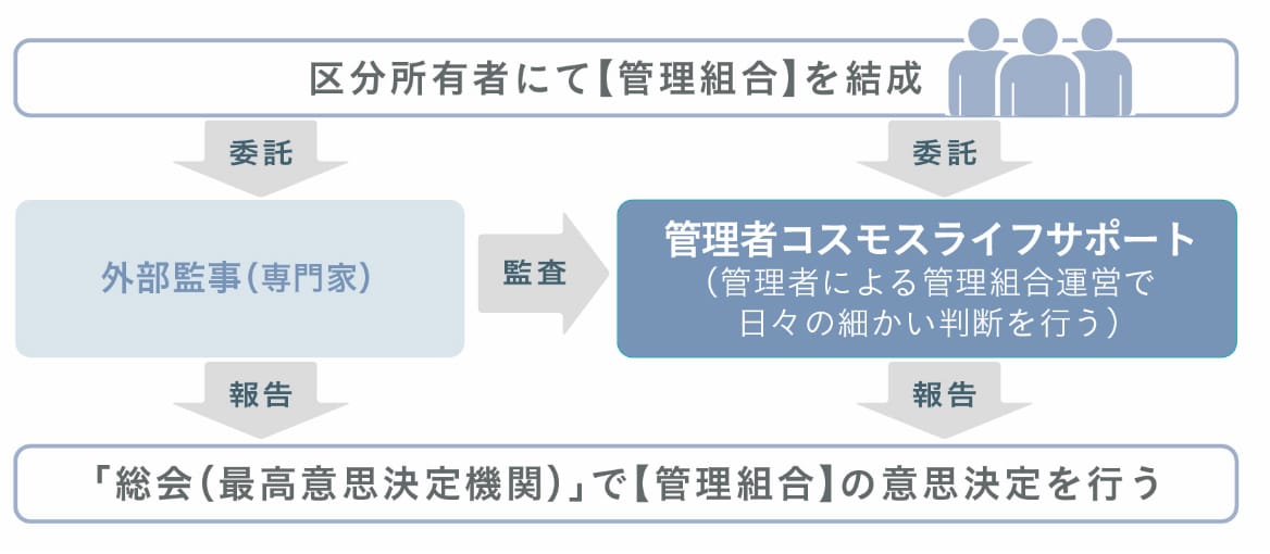 管理組合運営を理事会に替わり第三者(管理者:コスモスライフサポート)が行います。ご入居者は理事長・役員などを務める必要がなく、組合参加の負担が大幅に軽減されます。予算・収支・総会決議事項等は管理組合総会にて報告を行うことで、透明性と安心を保証します。