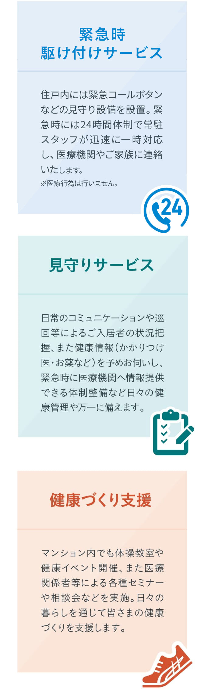 「緊急時駆け付けサービス」「見守りサービス」「健康づくり支援」を3本柱として、ご入居の皆さまの健康的な暮らしをサポートしてまいります。