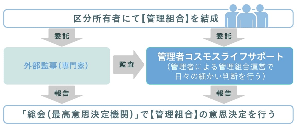 管理組合運営を理事会に替わり第三者(管理者:コスモスライフサポート)が行います。ご入居者は理事長・役員などを務める必要がなく、組合参加の負担が大幅に軽減されます。予算・収支・総会決議事項等は管理組合総会にて報告を行うことで、透明性と安心を保証します。