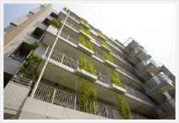 環境共生住宅をテーマとした住まいづくりで、豊富な実績を持つチームネットが提唱する「住環境統合理論」を取り入れたマンション「イニシア川口並木」では、緑・風・人の3つのつながりを取り入れています。住まいと周辺環境のつながりをデザインすることで快適性を高める工夫を施しています。敷地内の通路を遊歩道として演出し、敷地全体がひとつの庭になるように視覚や動線に配慮した植栽計画。またグリーンカーテンとよばれる壁面緑化、自転車置場の屋上緑化なども行っています。