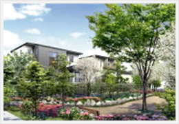 「イニシア箕面小野原」は「小野原西特定土地区画整理事業」に誕生した新発想の街です。この街で豊かな暮らしをご提案するために、「エコ」「コンフォート」「エレガント」という言葉ををリンクさせ、「ECOLE/エコレ」という新コンセプトをキーワードとしました。住まいには、緑のカーテンや緑化した屋上を設けて、屋上の直射日光を遮り、目にも涼しげな緑の景観を届けています。