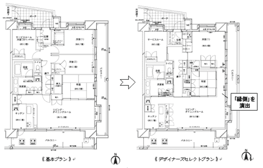 当マンションでは、39タイプの全住戸について、最大で14バリエーションの豊富なメニュープランを用意していますが、中でも、専有面積94.60m2 13戸、100.10m2 14戸と広さのある2タイプについては、メニュープランのバリエーションの一つとして 仕様の随所に特徴を持たせた「デザイナーズセレクトプラン」を用意しました。(※間取り変更は有料となります。)