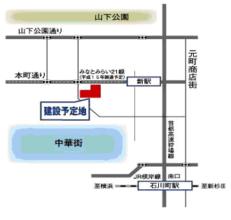 お客様に分り易い仕組みとすることによって、これまで以上に 自由な家作りがして頂けることも特徴であります。また、20~24階(20戸)についてはオーダーメイド、24階(4戸)は水廻り自由のフルオーダーといたしました。 立地につきましては、JR根岸線「石川町」駅 徒歩10分、横浜中華街と山下公園に はさまれた稀少性の高いエリアに位置、元町・山手も生活圏となる横浜の最先端ゾーンであります。また、平成15年度開通予定のみなとみらい21線新駅(始発駅)の誕生時には、地下通路でサブエントランスに直接アクセスが可能となる予定となっております。 ■「YOKOHAMA DEARTOWER(横濱ディアタワー)」 物件概要 ■ ・所在地:神奈川県横浜市中区山下町80番3他(地番) ・交 通:JR根岸線 石川町駅より徒歩10分 ・総戸数:264戸(住戸262戸・店舗2戸) ・構造・規模:鉄筋コンクリート造 地上25階地下1階建 ・住居専有面積:57.51m2~148.59m2 ・竣工予定/入居予定:平成15年9月下旬 / 平成15年10月上旬 ・価格:未定 <完成予想図> ![]() <物件位置> |