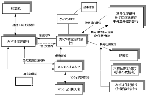 特定社債の発行に当たり、SPCは、みずほアセット信託銀行(株)(現・みずほ信託銀行)との不動産信託契約、(株)錢高組との建築工事請負契約の締結 等を経て、本日、格付機関(株)格付投資情報センター(R&I)により「A」(100億円分)および「BBB」(5億円分)の本格付けを取得しました。 なお、特定社債の元本償還および利払いは、最終的には当社のマンション分譲代金(約290億円)を原資として2005年春に実施する予定です。 対象となる「コスモポリス品川」は、品川駅より徒歩10分、都心への交通利便が高い立地に、輸入建具やビルトイン(天井埋め込み)エアコンなどを標準装備した38.47m2〜137.44m2・1DK〜4LDKの80タイプ超の基本住戸プランを用意した上、高さ5m・2層吹き抜けの「メインロビー」や「カフェラウンジ・ライブラリー」、最上階40階の「スカイラウンジ」、屋上の「エアリーガーデン」など多数の共用施設を設置した最新の都心型タワーマンションとなります。今年1月のモデルルームオープン以来、累計来場数は2,500組を数え、4月中旬より登録販売を開始する予定です。 ◆ スキームについて ◆ 当社は、当プロジェクトの開発に当たり、大和証券SMBC(株)、(株)三井住友銀行、みずほ信託銀行(株)と共同で、単独の大規模分譲マンション開発では初めてとなる、建物完成前に市場から資金調達する開発型証券化スキームを構築いたしました。これは、資金調達手段の多様化を目的として、当社の商品企画力・販売力等を背景に、市場からの直接金融による 従来の金融機関からの長期借入を下回る調達コストの実現、および、調達資金のオフバランス化による財務体質の強化を最大の特徴とした新スキームです。