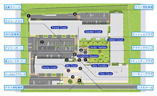 当プロジェクトは、三方を広大な3つの公園に囲まれた 総敷地面積14,000m2超の敷地に、南向き中心の低層3階建(一部4階建)の住居棟6棟と共用施設を備えた共用棟、中庭などを配した、総戸数 139戸の「環境共生型」プロジェクトです。 なお、建物の外観・内装デザイン、共用施設やご入居者向けサービスの企画に当たっては、計画エリアである本牧に暮らす方々を中心に計2回のアンケート調査を実施し、のべ1,012件のアンケート結果を随所に反映しています。 当プロジェクトの主な特徴は、以下のとおりとなっています。 ● 立地 第一種低層住居専用地域・第三種風致地区内という希少な住宅地でありながら、アミューズメント施設が集中する「マイカル本牧」へも徒歩圏と生活利便性も高いエリアです。計画敷地は、東に三溪園、南に本牧市民公園、西に本牧臨海公園と三方を公園に囲まれ、さらに南面には根岸湾を望む、海抜約20mの高台に立地します。 ● 共用施設 14,000m2超の敷地を活かし、四季を通して花木・草花を楽しめる植栽プランニングを施した、約830m2の中庭「センターガーデン」の他、中庭に接する敷地中央の共用棟「コモンスクエア」内のオープンカフェ・集会室・キッズルーム・ゲストルームといった、居住者のコミュニケーションを深める空間を中心に企画しています。 その他、共用施設の商品企画アンケート項目で最も多い77.5%(複数回答可)の方からご要望があった来客用駐車場(4台分)の他、飲料水やジュースなどを揃えたベンダーコーナー、ペットのためのグルーミングルーム、根岸湾や三溪園を見渡す屋上ガーデンなど、多彩なだけではなく、アンケート結果を基にお客様のご要望を随所に反映した共用施設を設置しています。 ● 住戸プランニング それぞれに個性を持たせた6棟の住居棟に、全13タイプ・64バリエーションの住戸プランを提案しています。 ・「フォレストコート」: サイドインエントランスを採用し、玄関を中心にリビングなどの共有空間(パブ リックゾーン)と寝室・居室などの専有空間(プライベートゾーン)を分ける (=P/P分離)ことで家族のプライバシーを重視したプラン。一階住戸は、専用庭のみ設置か、専用庭・専用駐車場併設か選択が可能。 ・「ガーデンコート」: 共用の中庭に接する特長を活かし、「中庭を望むプライベート空間」をコンセプトとした2面採光の出部屋設置プランや1階住戸の約23m2専用庭付プラン、最上階3階住戸の約19m2ルーフバルコニー付プラン。 ・「グリーンコート」: 八聖殿のある本牧臨海公園を見渡せる眺望を特長とした棟。1階住戸には、 専用庭に野菜やハーブなどの栽培が楽しめる土敷きの家庭菜園コーナーを設置。 ・「ファインコート」: 住戸内に吹抜スペースを設け、浴室・トイレ・廊下・マルチルームなどの採光と通風を実現。専有面積90.19m2~106.54m2、全プランで15畳超の南面リビングダイニングを設置。 ・ 「スカイコート」 : 1階共用エントランス、共用屋上ガーデン設置棟。12.4mのワイドスパンを利用した南面4室プラン(1住戸のみ)や海を望む南面「ビューバス」プランを基本プランとした、水回りの位置変更が可能なセミオーダーメードプラン(※期間限定・有償)。 ・ 「サニーコート」 : 南向きのワイドなリビング・ダイニングを設置した住戸プラン。一階住戸に設置する専用庭は、庭全体をガーデンパーティなどに利用できる空間とするプラン か、庭の半分を戸建感覚で専用駐車場として利用するプランか選択が可能。