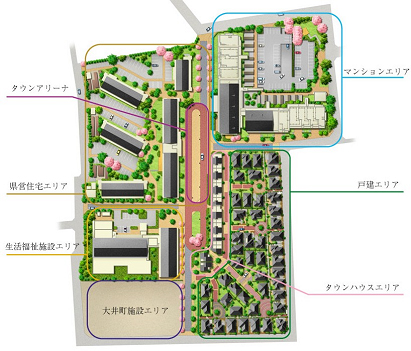 <各エリアの主な特徴> (1) 分譲マンションエリア(『コスモガーデンズ七彩の街』総戸数141戸) ・街の中で最高・最大規模である、地上11階建・2棟全141戸で構成。 ・住戸平均専有面積約105m2を確保し、プランはロフト付き・ルーフバルコニー付き・専用カーポート付き・専用庭付きなど、個性的な26タイプを用意。 ・共用施設として、戸建住宅・タウンハウス居住者も使用できる集会室 兼 キッズルームのほか、芝敷きの広場、ラウンジなど、様々なコミュニティ空間を設置。 敷地内自走式駐車場100%設置。 (2) 分譲戸建住宅エリア (『コスモアベニュー七彩の街』総区画数49区画<建築条件付土地分譲10区画含む>) ・街の中で最も南側に位置。エリア内に外観デザインに統一感を持たせた住戸、インターロッキング敷き道路、街路樹などを計画的に配置。また、全住戸が効率的に共有できる約100m2の開放空間を5ヵ所に設置。 ・住宅は、壁面を外側から断熱材でくるみ、外壁との間に通気層を設けることで断熱性・通気性に優れ、さらに、省エネ・健康・耐久性・遮音性にも優れた「外断熱外通気方式」による木造2×4(ツーバイフォー)工法を採用。また、一部住戸ではスチールの枠材とウッドパネルを組み合わせた2×4工法で、高品質・高精度を特長とした「トヨタSW(スチールフレーム&ウッドパネル)工法」を採用。 (3) 分譲タウンハウスエリア(『コスモアベニュー七彩の街 センターコート』総戸数13戸) ・街の中心部に位置。 ・3階建のメゾネット型住戸を連続して設計し、共用廊下などの共用部分がほとんどなく、各住戸の独立性が確保されるといった戸建住宅の特長と、長期修繕計画や管理があるほか、敷地の有効活用が図られるといったマンションの特長を併せ持った連続テラス型住宅。 ・各住戸には戸建住宅同様に、専用ガレージや屋上バルコニーを設置。さらに、1階部分を店舗 や画廊などとしても使えるプランを用意。 (4) 「タウンアリーナ」(街のシンボルであるコミュニティ空間) ・街の中心を南北に縦断する道路の中央部に位置。電柱や電線が出ないすっきりと開放感のあ る景観。 様々な世代の方々が多目的スペースとして利用できるコミュニティ空間。 (5) 県営賃貸住宅エリア(125戸) ・埼玉県営の賃貸住宅。一部住戸では、協同居住型の集合住宅(コレクティブハウス)を計画。 (6) 生活福祉施設エリア ・(株)生活科学運営により、老人ホームと福祉・介護施設「ライフ&シニアハウス七彩の街」(仮 称)を建設し、施設内にはクリニックや地域住民との交流ゾーンなどを設置する予定。ケアマネ ージャーによる介護相談や、訪問介護、短期入所介護などのサービスを提供し、長寿社会に対 応した設計指針で、多様化する中・高齢者ニーズに幅広く対応。 (7) 大井町施設エリア ・地域住民の交流の場となる「ふれあいセンター」や「公開空地」などを大井町が施行予定。