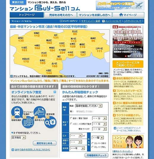 『マンションBuy-Sellコム(マンションバイセルコム)』を2月10日(金)より本格オープンいたします。 当サイトは、会員登録(入会金・会費無料)いただいたユーザーが、所有マンションの売却検討や資産価値算定を希望する場合に 精度の高い価格査定を瞬時、自動に行うことができるほか、過去のマンション売り出し事例を検索、物件同士の比較検討ができるなどのサービスを、全てサイト内で無料提供する 業界で例のないインターネットサービスを特徴としています。また、必要に応じて、売買希望者同士の情報を取り次ぐマッチングサービスを提供するなど、当サイトのサービスを通して、中古マンションの流通促進、ひいては不動産流通市場の活性化を目指します。 ※平成18年2月時点 対象エリア:東京23区内中古マンション また、昨年10月20日より、試行期間としてサイトの自動査定サービスについて運用いたしましたが、その間のサイトアクセス数は、延べ約208,000ページビュー(各ページへのアクセス合計)を数えました。 内、オンライン自動査定で実際に中古マンション価格の査定が行われたのは2,105名、3,279件となっております。 今後につきましては、本年9月を目途に、同サービスの提供エリアを1都3県に拡大していく予定です。 ■『マンションBuy-Sellコム』特長 ①「マンションデータバンク」(23区内約6,500件の中古マンション売出事例をデータベース化) ・ 平成16年4月以降に23区内で売り出された約6,500件(平成18年2月現在)の中古マンションデータベースについて、当社独自の20項目を超える評価基準に基づき、立地・建物共用部分・専有部分に関する評点付けを行い、全物件を点数化。月1回の頻度でデータ更新。 ・ 各物件概要データ・売出価格をサイト内で公開。検索機能がついて、現在売り出し中の中古マンションと過去に売り出された中古マンションなど、物件同士の比較検討も可能。 ②精度の高い自動査定機能 【査定STEP1】 査定対象の中古マンションについて必要項目を入力すると、「マンションデー タバンク」の中古マンション事例と同様に物件点数を自動算出。 【査定STEP2】 物件点数をもとに、査定対象の中古マンションと類似売出事例の推定成約価 格との比較(取引事例比較法)によって、対象マンションの評価価格を瞬時に 算出。 ③「売りたい人」「買いたい人」のマッチングシステム ・ サイト上に、売りたい人は所有の中古マンションを登録(物件概要、参考画像等物件PR情報の発信可能)し、買いたい人は希望条件(エリア・徒歩・築年数・間取り・価格等)を登録しておくことで、売買希望者同士の情報を素早く取り次ぐ「マッチングシステム」。 ※ 「マッチングシステム」を利用して、実際の不動産売買を行う際には、当社流通営業部との媒介契約を締結いただきます(成約時仲介手数料発生)。サイト内で当事者取引が成立するものではありません。 ④その他の付加機能 ● 「マイページ」機能:最新査定価格・売出中古マンション情報をセルフチェック ・ 売りたい人:「マイページ」上に所有の中古マンション情報を登録しておくことで、月1回の頻 度で更新される「マンションデータバンク」の最新売り出し事例を反映させた、 最新査定価格のセルフチェックが可能。 ・ 買いたい人:希望条件を入力しておくことで、条件に添った売り出し中の中古マンション情報 を「マイページ」上に自動配信。 ● サイト内「コンシェルジュ」無料相談サービス ・ 実際に中古マンション売却・購入に関する相談を行う場合は、専属の「コンシェルジュ」(宅地建物取引主任者)が無料で対応。サイト内で不動産取引に関する一般知識から、査定価格・売買にかかる諸費用といった個別内容に関するご質問まで、専門的なコンサルティングサービスを提供。 ■『マンションBuy-Sellコム』開設の背景 当社では平成16年より、一般のユーザーに当サイトの中古マンション価格査定サービスを体験(査定件数:23区内162物件)していただいたほか、約20名参加のモニターインタビューを行うなどのマーケティング活動を実施いたしました。 同時に実施したアンケート調査(アンケート総数:744件)によると、「売却価格の根拠提示・きめ細かいサービス提供が受けられるか不安に思う」と回答した方は約60%に上り、また、「サイト上の客観的な価格査定サービスがあれば利用する」と回答した方は75%を超える結果となりました。 さらに、サイト試行期間中の昨年10月20日から11月20日までのサイト利用者約120人にアンケートを実施したところ、約7割の方に「便利だし、結果も役に立ちそう」という感想をいただいきました。 当サイトの開設は、このようなマーケティング活動から得られたお客様のニーズに対応していくもので、中古住宅取引における情報や知識を広く、詳しく、簡単に入手していただくことを実現し、売買価格や手続きの不透明さ、売買に対する不安といった課題の払拭を目指します。さらに、売りたい人、買いたい人、双方が