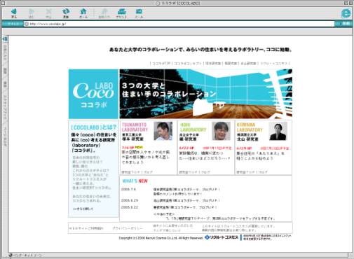 21世紀に入って、人びとの生活スタイルの多様な変化と併せて、ファッションや食に始まり「住」の分野についての意識や関心が高まってきています。「住」の量から質への転換が進み始める中、株式会社リクルートコスモス(本社:東京都港区海岸3-9-15、社長:町田公志)は、大学の建築系研究室と生活者とのパイプ役となり、これからの共同住宅のあり方について共同研究するプロジェクト『COCOLABO(ココラボ)』を始動しました。 『COCOLABO』は、個々(coco)の住まいを共に(co)考える研究所(laboratory)という意味から名付けた名称です。当社が、日本の共同住宅の新しいあり方を考えるプロジェクトとして、東京工業大学、共立女子大学、横浜国立大学の建築系研究室が展開する研究を支援し、生活者の生の意見を取り入れながら研究を発展させていく試みです。各研究室では、学生たちがプロフェッサー・アーキテクト(※参照)と一体となって、独創性溢れるアプローチでの研究を展開。内容は既にオープンしたホームページhttp://www.cocolabo.jp/ にブログ形式で発表され、ホームページ上に生活者たちが生の意見を寄せ、研究室はその意見を取り入れさらに研究を進めています(既にユーザーから相当数のコメントが寄せられています)。 研究は4ヶ月間に渡って展開され、10月に各研究室で最終成果をまとめ、11月に展示会・ワークショップ形式で発表の予定です。 ※プロフェッサー・アーキテクト: 建築家として活躍しながら、建築を指導・研究し、学生を育てていく教授 昨今、プロフェッサー・アーキテクトが活躍する時代の到来と併せて、建築・住宅のデザイン情報に精通し、自分のイメージやこだわりを持つ新しい生活者達が登場してきました。『COCOLABO』は、「住」への関心の高い生活者と専門に研究を進める大学、そして実際の開発者であるディベロッパーが双方向にコミュニケーションを図るという、住宅分野においては殆ど例のない「プランニング・コラボレーション」です。 当社では、今回のプロジェクトを「住」をテーマにした演習の新基準と位置づけ、未来の住まいを創造する新しい発想や提言が生まれてくることを目指して参ります。 <プロジェクトのお問合せ先> 株式会社リクルートコスモス『COCOLABO』プロジェクト 〒108-8427 東京都港区海岸3-9-15 LOOP-Xビル 電話:03-5440-4055/Email:m-kikuchi@rc.rcg.co.jp <参考:『COCOLABO』ホームページTOP画像> ![]() <参考:各大学のオリジナリティに溢れた研究活動> 参加する3つの研究室は、40代〜60代の3つの世代を代表するプロフェッサー・アーキテクトが率い、個性豊かな研究が展開されています。 ■東京工業大学建築学科(塚本研究室) ●プロフェッサー・アーキテクト:塚本由晴助教授 / 学生:7名 ●全体テーマ 「新しいモノの集まり方」 従来の、人に対して部屋を作り、そこにモノが集まっていくという作り方ではなく、モノのレイアウトから場所を作り、人がそこをどう使って生活するかを考えていきます。本に埋め尽くされた場所や家族みんなの巨大クローゼットのような場所、様々なモノが一同に見える場所や何もない場所など、多様な環境が形成され、これまでの標準的なマンションのプランでは実現できなかった生活現象が生まれます。 塚本助教授は、このプロジェクトを通して、「つかう」と「つくる」の新しい関係が築けるのではないかと期待しています。 ●第1回テーマ 「住宅はもはやマンガ喫茶みたいなものでもよいのではないか?」 顔の見えない個人を根拠にする代わりに住宅の中に必ず現れてくるモノを根拠に作ったらどうなるかを考え、1回目は家中の本を集めた書斎、お父さんの趣味のコーナー、或いはリラックスしたい時に使うコーナー、集中したい時に使うコーナーなど、マンガ喫茶のように小さなコーナーをたくさん作り、中央に小さなコーナーで起きていることを同時に見渡せる、開放感のある大きな空間を配したプランを提案します。 <研究室TOP画像> ![]() <ブログTOP画像> ![]() ■共立女子大学家政学部生活美術学科建築専攻(堀研究室) ●プロフェッサー・アーキテクト:堀啓二助教授 / 学生:6名 ●全体テーマ: 「外に開いた住まいの可能性 生活順応型の住まい」 家族の形態や生活様式の変化に着目し、ライフサイクルやライフステージにあわせて変わっていける住まいを提案。これまでのマンションは、扉一枚で共用廊下と住まいが閉じる関係にありましたが、ライフスタイルが多様となっているこの時代に、もしプライバシーやセキュリティを考慮し、住まいを外に開いたら、住まい方も豊かに大きく変わるのではないか、という視点で研究を行ないます。 堀助教授は、このプロジェクトを通して、住み続けられる住まいが見えてくるのではないかと期待しています。 ●第1回テーマ 「始まります!ラブ・サバ生活〜DINKS夫婦2人の場合〜」 共に自分の仕事を持ち、個々の仕事やプライバシーも尊重しながら夢に向かって生き生きと暮らす若い夫婦を想定。SOHOなアイデア