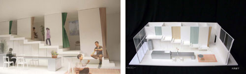 『COCOLABO 2007』では、6月から毎月、「1.5階×○○」というテーマで全5回研究発表いたします。第1回目である6月のテーマは、「1.5階×階段」です。階段は、平らな床よりハッキリと、壁よりあいまいに空間を分けることができます。1.5階の高さを持つ住宅の中に階段を積極的に取り入れた3つのタイプを提案し、「1.5階×階段」をどう使い、どんな生活を送るかを生活者のご意見を取り入れながら研究しています。7月のテーマは「1.5階×子供」。8月以降のテーマは順次ウェブサイト上で発表いたします。 『1.5階×階段』の提案例 |