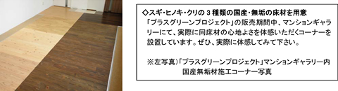 ●国産・無垢のスギ・ヒノキ・クリの床材(有償オプション) 生物多様性の保全を目指し、当社では、林野庁の助成による「住宅分野への地域材供給支援事業」において、(財)日本住宅・木材技術センターと国産無垢材を活用した床材の共同研究開発に取り組みました。そして、「プラスグリーンプロジェクト」では、スギ・ヒノキ・クリの3種類の国産無垢材を活用した床材をセレクトすることを可能(※有償オプション、一部洋室のみ採用可)にし、国産無垢材の持つ豊かな香りやあたたかな触り心地をご提供いたします。 現在、日本で使われる住宅建材や内装材、家具を始めとする木材は、安価な輸入材が多く、国産材の消費は激減しています。国産材消費量の減少により、山を育てるために必要な、間伐など森の手入れが不十分となり、土が痩せ、土砂崩れなどの災害を引き起こしています。また、かつては落ち葉が土に交じって腐葉土になり、そこに含まれるミネラルなどの栄養素が川に流れ、海を潤していましたが、その流れがなくなることで、自然循環に悪影響を及ぼしています。さらに、海外では輸出のために違法伐採が行われているという実情もあります。当社ではこのような環境問題の視点を捉えながら、国産無垢材の豊かな香りや心地よい肌触りを住まいに取り入れることにいたしました。