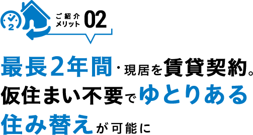 「お住み替えは決まったもののご希望のお住まいがまだ見つかっていない」「未竣工の新居への引っ越しになるためまだ転居できない」といったご状況の場合、従来の売却では仮住まいが必要でした。しかし最長2年間の賃貸期間が持てることで、仮住まいの手間を取ることなくスムーズな住み替えをご案内することができます。