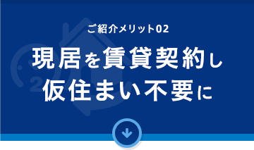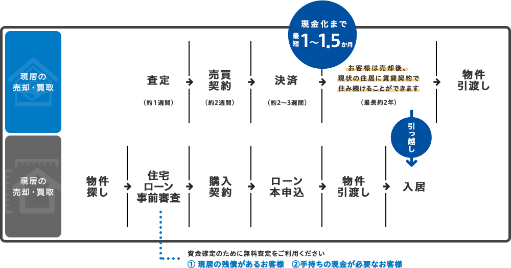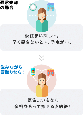 当社が現居を直接買取りすることで「新居購入のための資金確定」が可能になり、その後賃貸借契約を行うことで住み替えに伴う仮住まいが不要になり、「スムーズな住み替え」が可能になります。
