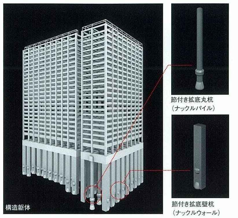 軸部の断面を丸杭径1.3m~2.1m、壁杭1m×4~4.4mとするナックル(節)付き拡底杭(アースドリル工法で築造)合計63本を採用。丸型のナックルパイルを内部に、摩擦力の高い壁状のナックルウォールを外側に打設しました。