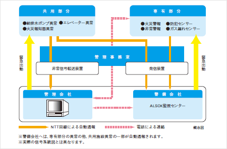 管理会社による遠隔監視システムで、共用部分の設備の異常を24時間体制で監視。 また「水漏れ」「電気がつかない」「ガスが使えない」等のトラブルには、24時間、電話相談を受け付けている。