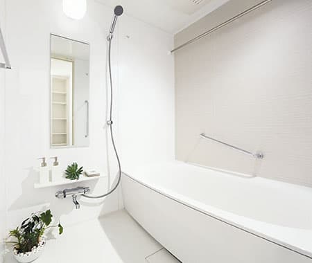 リラックスタイムを演出するバスルームは、シンプルながらも機能性あふれる空間に。 湿気対策のため、床材には水ハケの良い素材を、また浴室暖房乾燥機を標準装備しています。