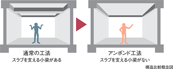 コンクリートスラブ内部にPC鋼線を通して張力を与えることにより、床スラブを水平に保つことができます。天井を支える小梁がなく、圧迫感が少なく、フラットですっきりとした住空間を実現できます。また、将来的なリフォームの際にも設計上の自由度が高くなり、剛性が高く、たわみやひび割れを防ぐ効果があります。