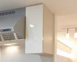 調理スペースに吊り戸棚を設置。扉は鏡面仕上げ。地震の際に内容物の落下を防ぐ耐震ラッチ付きです。