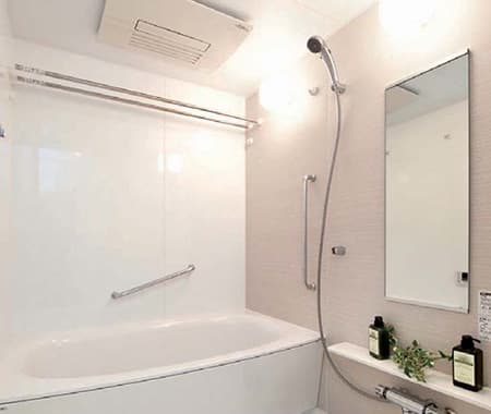 手元のスイッチで止められるワンストップ機能付シャワーヘッドや、雨の日もお洗濯ができる浴室乾燥機付き。快適なバスタイムを実現します。