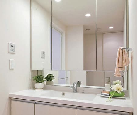 汚れの付きやすい縁がないボウル一体型カウンター、カウンター幅いっぱいのワイドな三面鏡を採用。鏡の裏面は収納スペースになっています。
