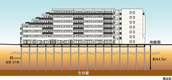 標準貫入試験により、地盤が信頼に足るN値及び厚さを有しているとされた「支持層」まで杭の先端を届かせることで、杭の先端の抵抗力と杭と地盤の間に働く摩擦力により建物を支える基礎構造です。