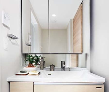 朝の忙しいひと時に求められるのはスムーズな使い勝手。だからこそ2人が並んでも同時に使えるような広さや、多彩な収納を確保しました。