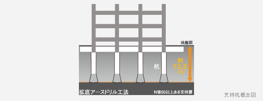 建物の安全性、安定性を高めるために、綿密な地盤調査を施し、地下約13.5mの堅牢な支持地盤に達するまで合計20本、直径1.2~1.4mの場所打コンクリート杭を打ち込み、強固な基礎構造を実現しています。