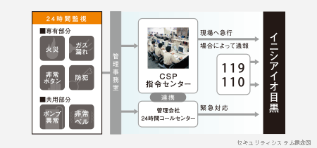 各住戸の開口部(一部除く)に防犯センサーを設置。センサー設定時に扉や窓の開きを感知すると警報を発しながら警備会社へ通報します。