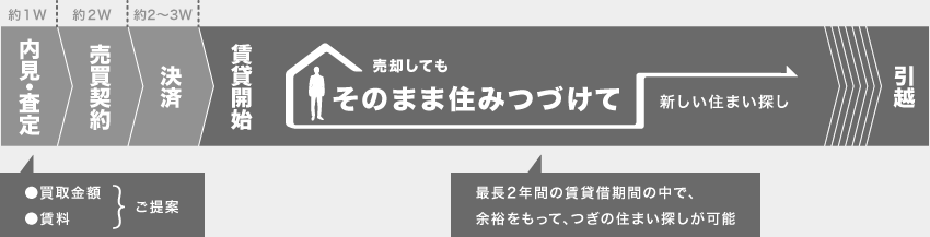 ご所有のマンションを短期間で現金化でき、マンションご売却後も、最長2年間(賃料低額プランは最長約1年間) 「そのまま住み続けていただける」お住み替え支援サーピスです。 ご売却後は当社と賃貸借契約を締結、賃料をお支払いいただきます。 ※賃料低額プランの居住期間は決済日の翌年前月末までとなります。実際の居住可能期間に関しては担当者にお問い合わせください。 |