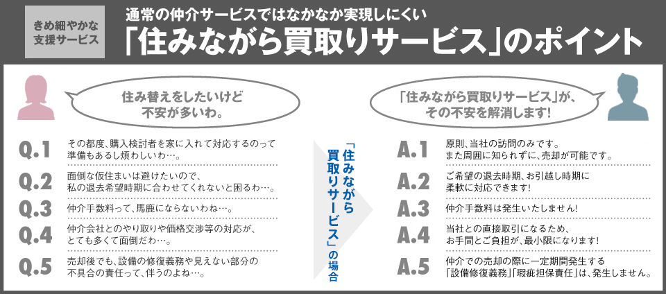 「住みながら買取りサービス」は、お客さまのマンションを当社にて買取りさせていただき、