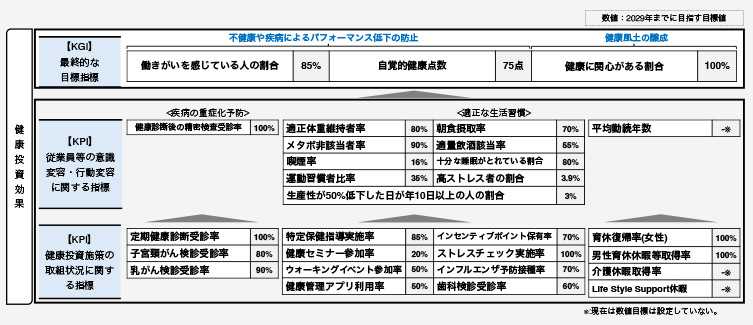 当社は、健康保険組合との強力な連携体制を生かした健康経営の推進が強みであり、幅広い施策の実施と共に、指標・実績の開示を行っています。従業員が主体的に健康活動に参加し、組織全体に健康文化が根付いている状態を目指すため、従業員の主体性を測る指標を多く取り入れ、目標設定しています。組織全体の健康状況を定期的に確認し、改善に取り組むことで、KGI目標の達成を目指します。