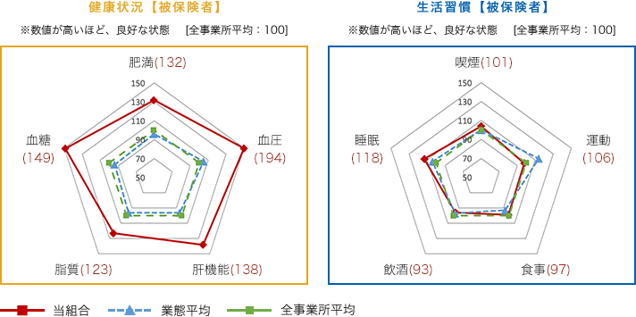 現在の従業員の健康状況の傾向は、全健康保険組合平均と比較して良好な状態であるのに対し、生活習慣の状況は平均に