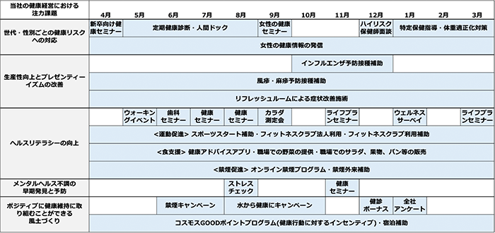 ※主な施策の実施費用(年間)・・・健康セミナー:356千円、ストレスチェック:1,500千円、オンライン診療・健康相談チャット:659万円、女性のための健康相談窓口:360万円、特定保健指導:128万円、ウェルネスサーベイ:205千円、水キャンペーン:440千円、ウォーキングイベント:33千円、禁煙キャンペーン:0円、カラダ測定会:848千円、パン、サラダ等の販売:364千円、コスモスGOODポイントプログラム:319千円