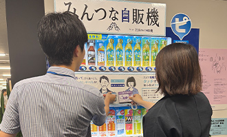 職場内に健康的な飲料を販売する自動販売機を設置しています。この自動販売機には、従業員同士2人で同時にタッチして、10秒以内に商品をそれぞれ選択すると、2人の飲料が無料になる“おごり機能”が付いており、従業員のコミュニケーションのきっかけとなっています。利用するたびに健康に、そして楽しくなる自動販売機です。