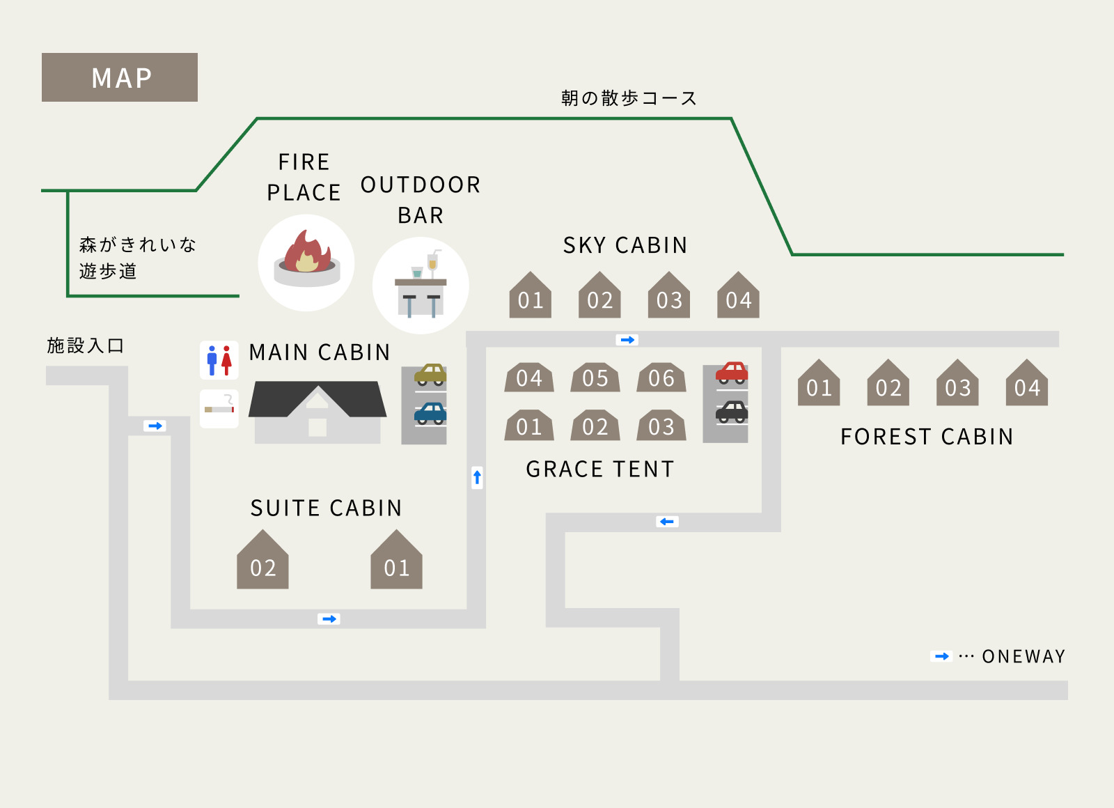 エアコン / 冷蔵庫 / ソファセット(ACTUS 製)/ シャワールーム (SKY CABIN、FOREST CABIN のみ)/ バスタブ (SUITE CABIN のみ)/ 洗面台 (GRACE TENT 除く、 GRACE TENT はメインキャビンにて利用可能) / 温水洗浄トイレ (GRACE TENT 除く、 GRACE TENT はメインキャビンにて利用可能)/ Bluetoothスピーカー