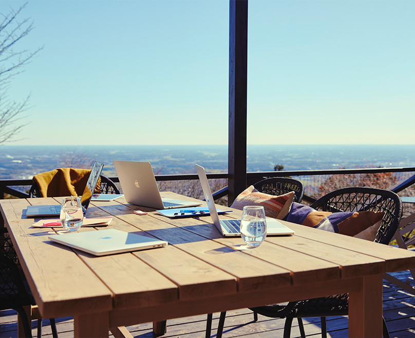 大きな空が広がるアウトドア 空間 。風や光を 感じて、仲間 とともに働きながら 楽しめ、楽しみながら働くアウトドアワーキングスタイル