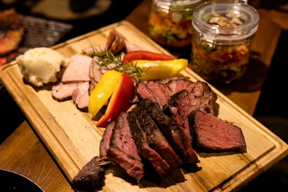 ETOWA KISARAZUの夕食は豪快なBBQです。目の前で、塊のお肉をシェフが焼き、ご提供します。大迫力の炎と、季節ごとに変わるメニューをお楽しみください。愛犬用のお席もご用意しております。