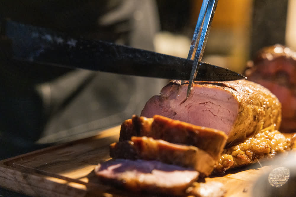 ETOWA KISARAZUの夕食は豪快なBBQです。目の前で、塊のお肉をシェフが焼き、ご提供します。大迫力の炎と、季節ごとに変わるメニューをお楽しみください。愛犬用のお席もご用意しております。